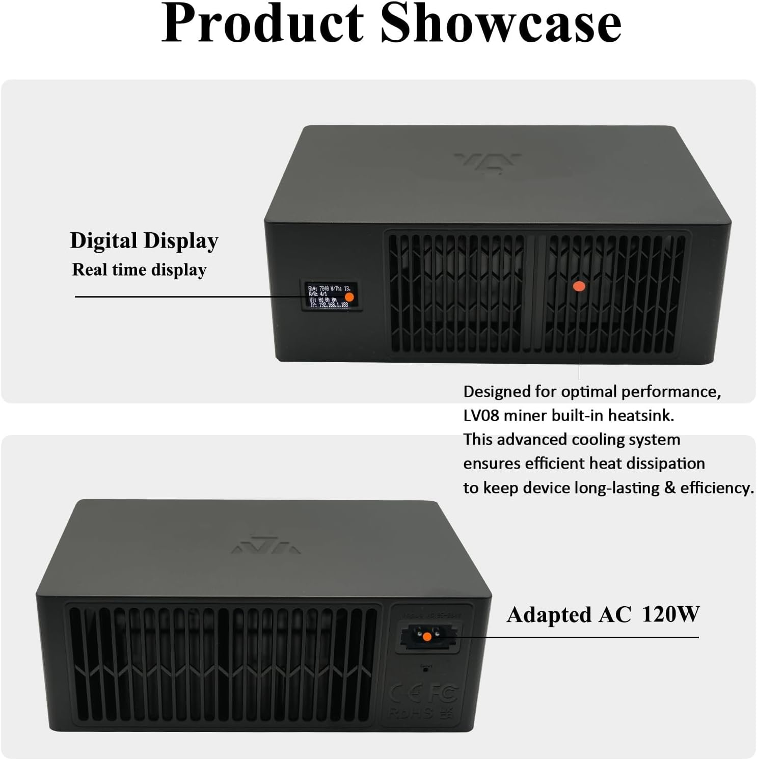 The LV08 mining machine also features a fan, which helps to keep the miner cool and quiet. The heatsink is made of high-quality aluminum, ensuring efficient heat dissipation, noise level ≤38dBA@25℃ , making it perfect for home or office use.
